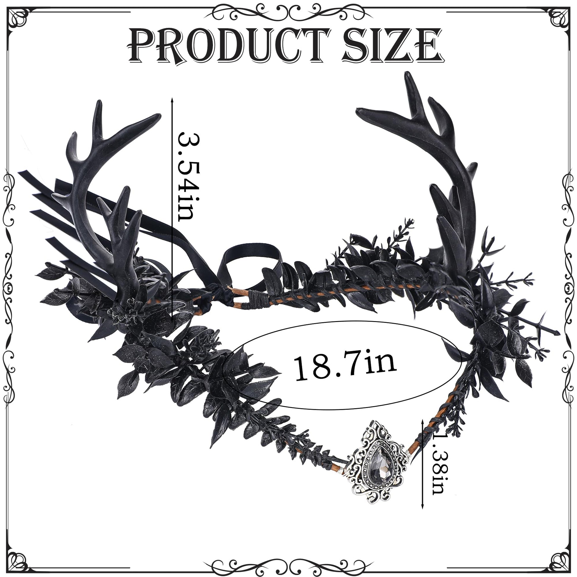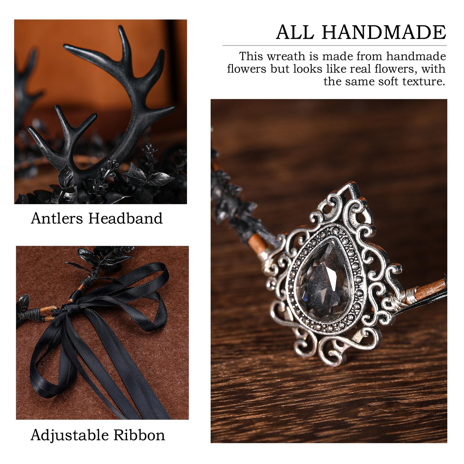 MOSTORY Black Flower Antler Crown - Dark Reindeer Headpiece Gothic Elf Circlet Deer Horns Headband for Women Cosplay Renaissance Goth Wedding Renfaire Accessory