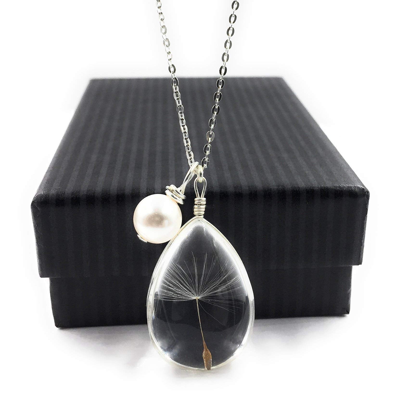Our most popular Dandelion wish necklace is a very sweet and charming necklace that fits any style range and any age range. Each purchase includes an inspirational pop-open 'Wish' card within each gift box, making your gift or purchase even more special. The Dandelion is encased in clear glass about the size of a quarter, which takes on the colors in the background (see photos). The crystal pearl charm gives this piece a unique elegance. The pearl is removable. The 18' chain is sterling silver. This necklace makes a unique and lovely gift for a loved one or even for yourself. Nickel-free and hypo-allergenic. Satisfaction Guaranteed. Please take care not to wear in pool or hot tub as prolonged exposure to water and certain chemicals may harm jewelery. We want you to enjoy your Aimee Tresor Jewelry for years to come. Best Wishes!