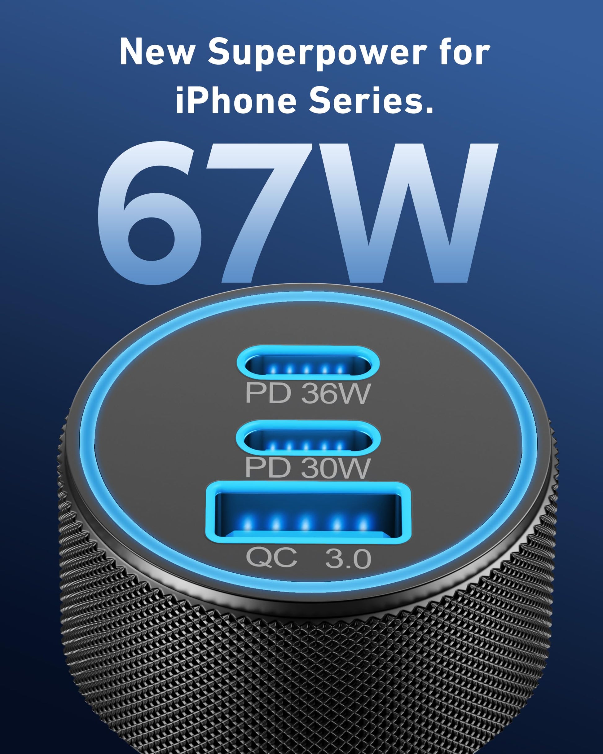 - 67W 3-Port Fast Car Charger: KENHAO 67 Watt USB C car charger support PD 37W Max (USB C) and QC 30W Max (USB-A) output, can fast charge for most USB-A and USBC devices simultaneously; One car charger for all your USB A & USBC devices, your ideal travel companion