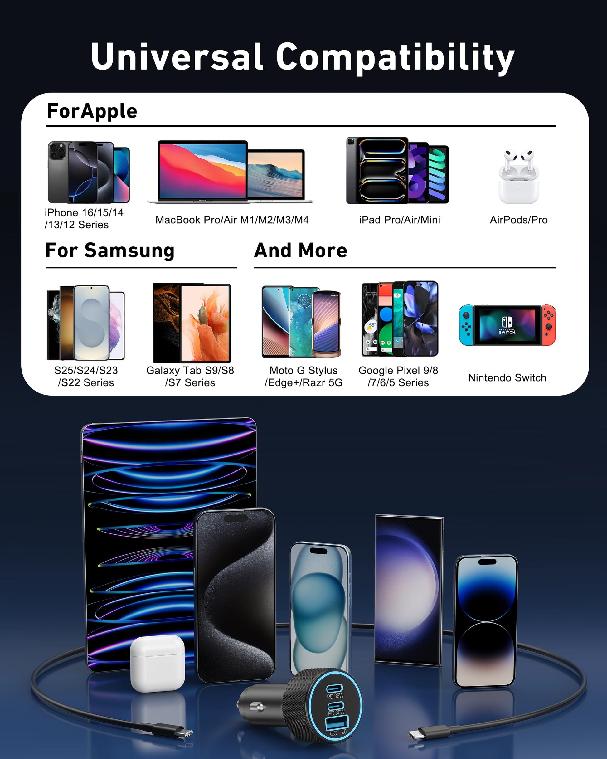 - Broad Compatibility: Car phone charger with Two USB-C and One USB-A Port output, can charge almost all USB Devices, compatible with iPhone 16/16e/15/14/13/12, XS/XR/X/8/7/6, iPad, Samsung Galaxy S25/S24/S23/S22/S21, Note 20/10/9, Google Pixel 8/7/6/5, AirPods, Smart watches, driving recorder, GPS navigation, car vacuum cleaner, power banks and other devices.