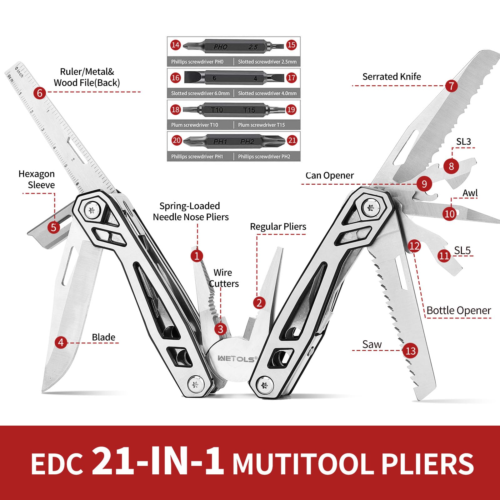 - 【21 tools in 1 】This hand tools features spring-loaded needle nose pliers, regular pliers, wire cutters, sharp blade like a swiss army knife, hexagon sleeve, metal/wood file,ruler, serrated knife, bottle opener, slotted screwdriver SL3, SL5, awl, can opener, saw, 4 x 2-sided bits( PH0, PH1, PH2, SL2.5, SL4, SL6, T10, T15)